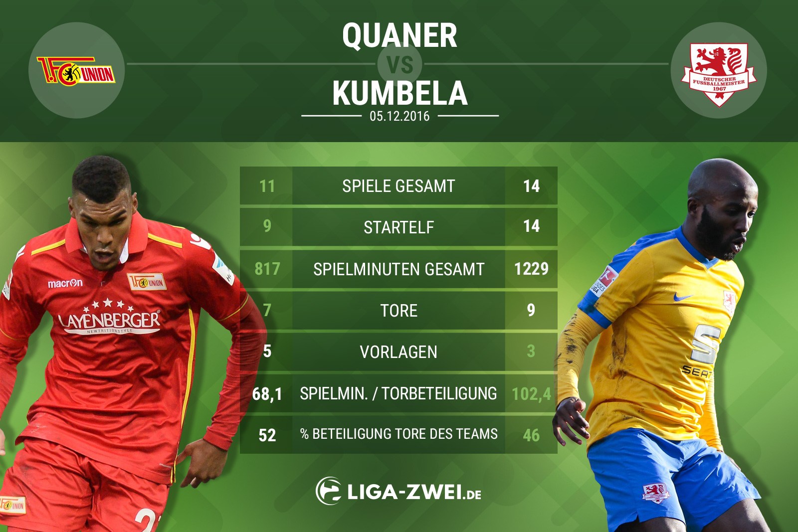 Das Topspiel zwischen Union Berlin und Eintracht Braunschweig heute Abend ist auch das Aufeinandertreffen der beiden Torjäger Collin Quaner und Domi Kumbela. Beide waren bisher an 12 Toren beteiligt, wobei Kumbela öfter selbst knipste. In puncto Effektivität geht das Duell an Quaner, der im Schnitt alle 68 Minuten an einem Treffer beteiligt ist, während Kumbela durchschnittlich 102 Minuten benötigt. Zudem ist Union stärker von Quaner abhängig, ist er doch an über der Hälfte aller bisheriger Tore direkt beteiligt.